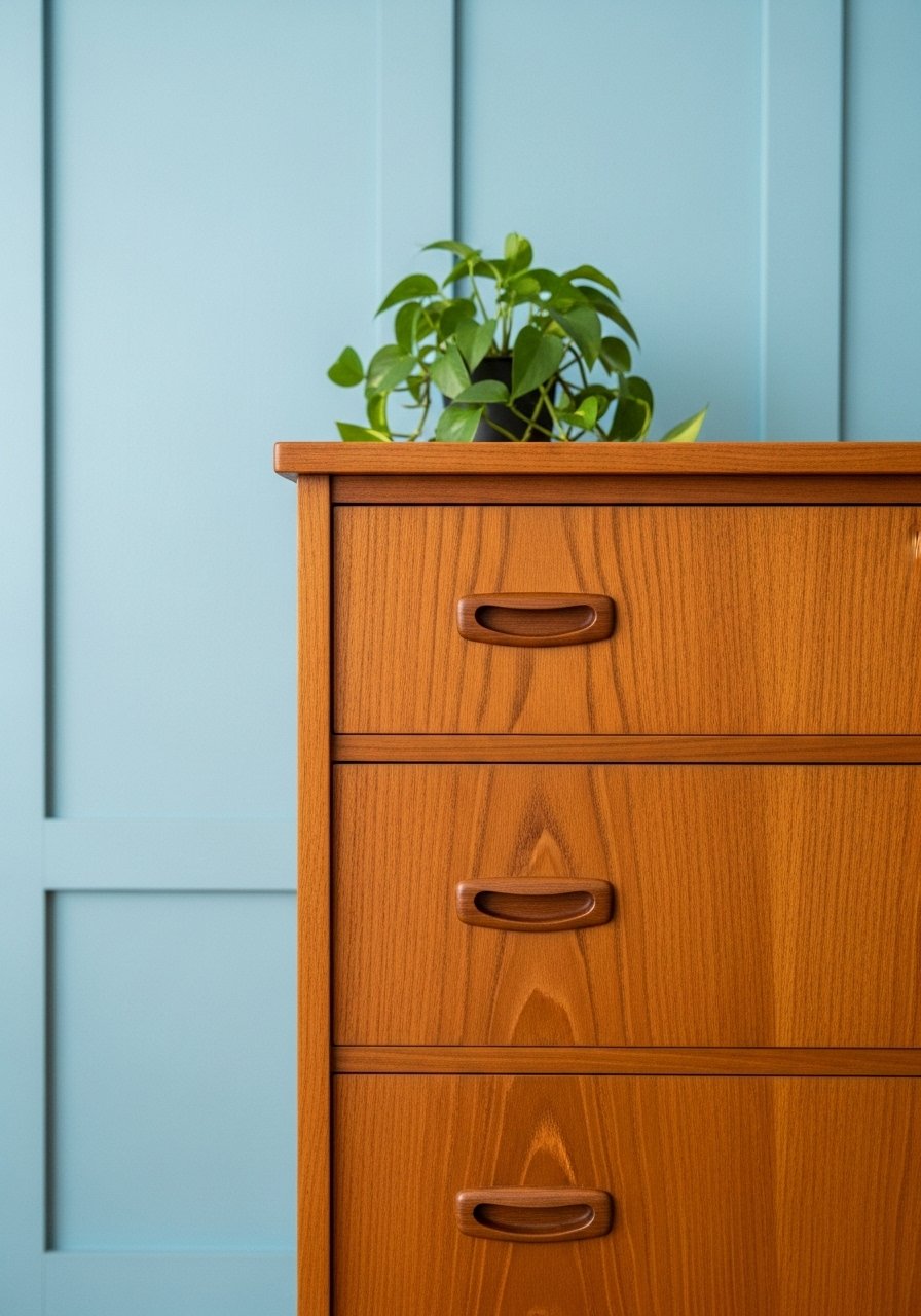 Pairing light blue walls with warm wood pieces added balance in my room. I used a walnut dresser and it cut the coolness of the blue. Early on I matched every piece to the paint and it felt flat. Introducing wood brought life and warmth.