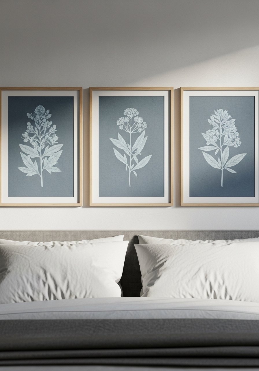 Botanical prints in muted blues made my walls feel layered and calm. I grouped two prints above the bed and they read like intentional art, not clutter. My early frames were too ornate and distracted; switching to slim, white frames helped the art breathe.