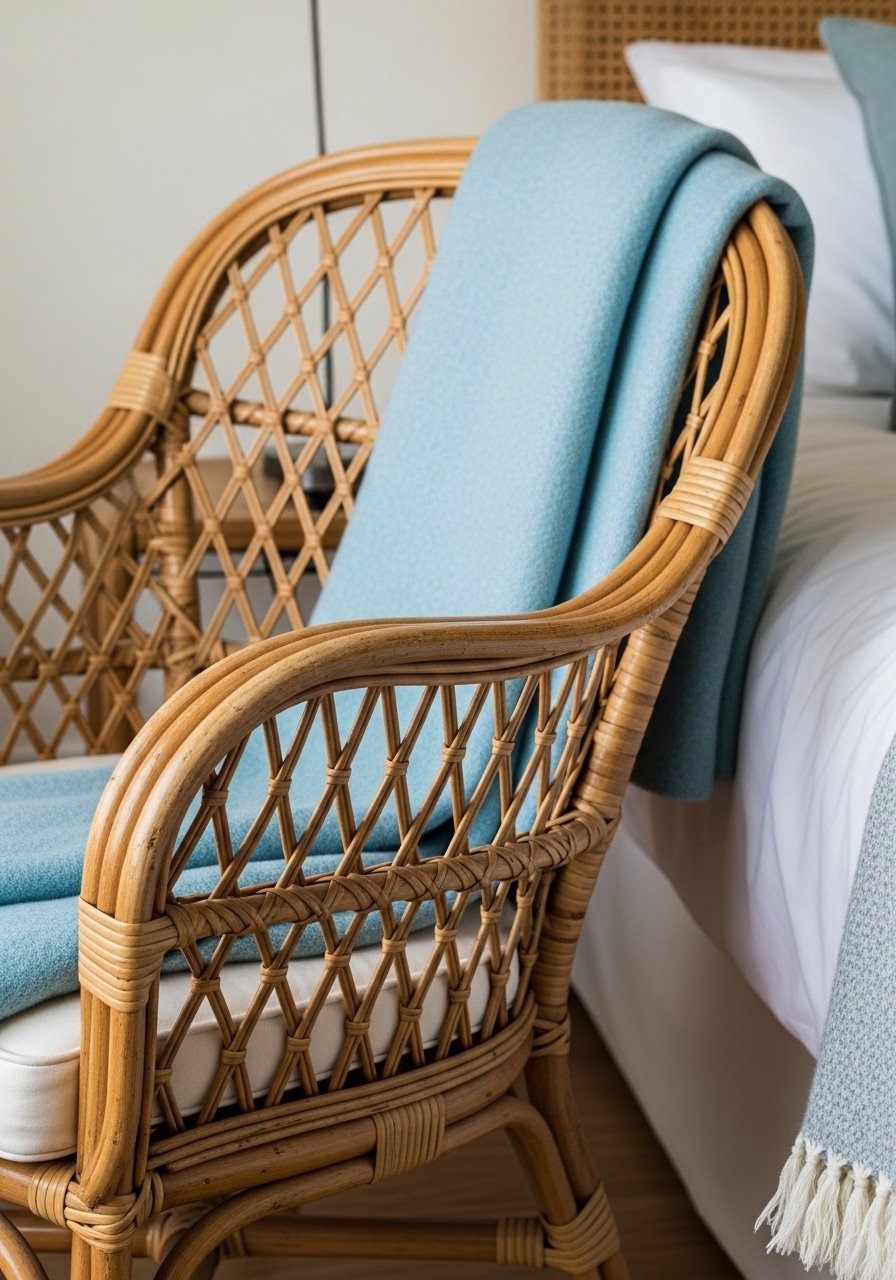I leaned into cottage vibes with a rattan chair and blue accents. The natural weave warms the blue and gives a casual, lived-in look. I once used plastic rattan and regretted it — natural materials look better aged.