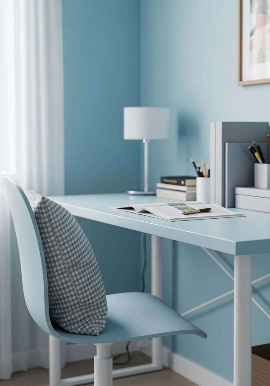 I created a tiny workspace with a light blue backdrop so it felt like part of the room. A slim desk and small lamp made it functional without clutter. My first desk was too deep and ate floor space; switching to a narrow profile solved that.