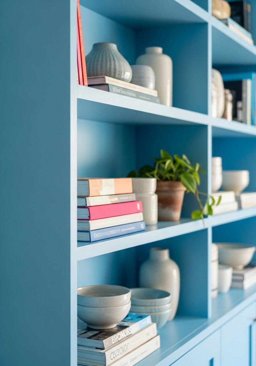 I painted built-in shelves the same light blue as the wall and used them to display ceramics and books. It made storage feel integrated and calm. My first shelf styling was too symmetrical; adding a few mismatched items made it feel real.