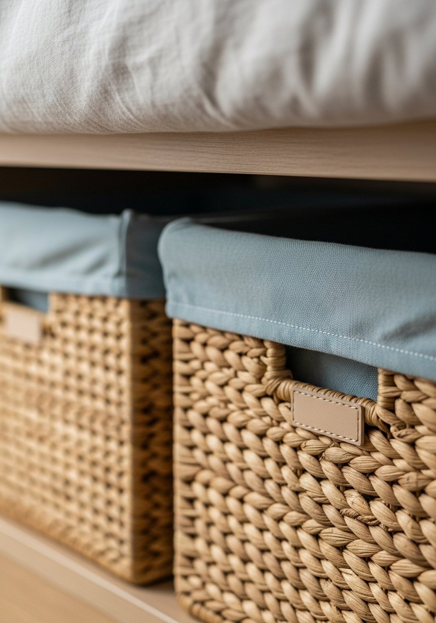 I use woven baskets with light blue liners to hide clutter and echo the room color. They keep the space tidy and soft. My mistake was buying rigid plastic bins that stuck out; baskets blend in and feel intentional.